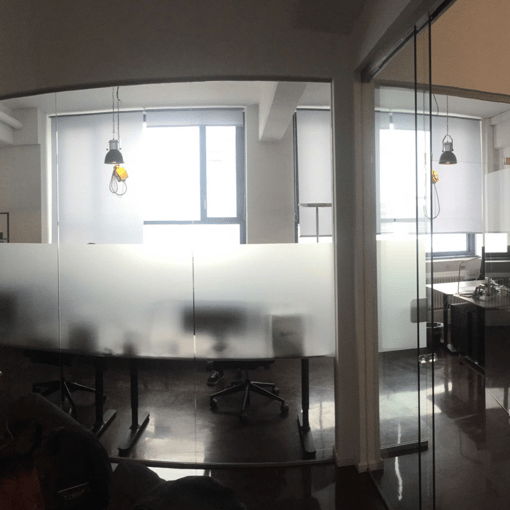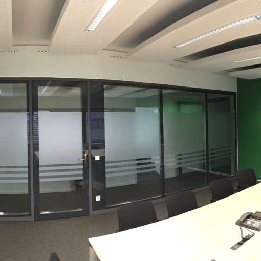 Milchglasfolien, die nur auf einem Teil der Fläche angebracht werden, eignen sich bestens für Konferenzräume und Büros. Sie schränken zwar die Durchsichtigkeit